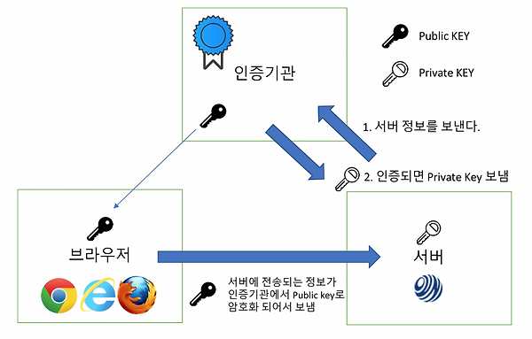 비대칭 키와 SSL 인증방식 그리고 handshakessl인증방식과 handshake를 설명하기 앞서서 대칭키와 비대칭키에 대해서 알아야한다. 대칭키대칭키는 하나의 키로 문서를 암호화 하는 방식이다. 대칭키는 키를 가지고 있는 사람은 이 키로 암호화된 문서를 복호화 할 수 있고 속도가 비대칭키 보다 빠르다는 장점이 있다. 비대칭키 비대칭키는 2개의 키로 암호화와 복호화가 되는데 예를들어 a, b키가 있고 문서를 a키로 암호화 했다면 b를 가진자만이 복호화를 할 수있고 반대로 문서를 b로 암호화 했다면 a키로 복호화가 가능하다. 비대칭키는 RSA 키방식을 주로 사용하고 여기서 키 a ,b 는 흔히 public key / private key로 말한다. SSL 인증방식 우리가 사용하는 웹사이트가 내정보를 안..